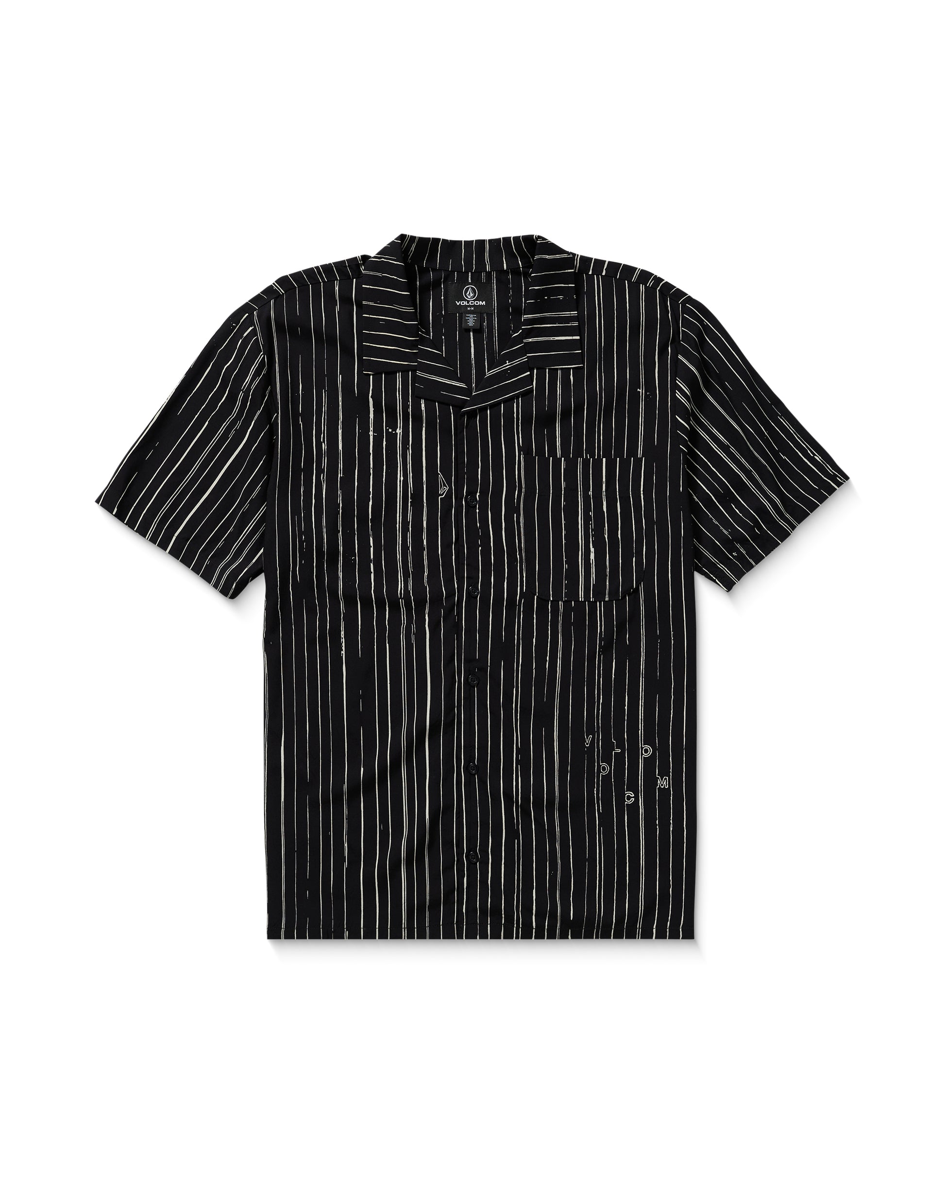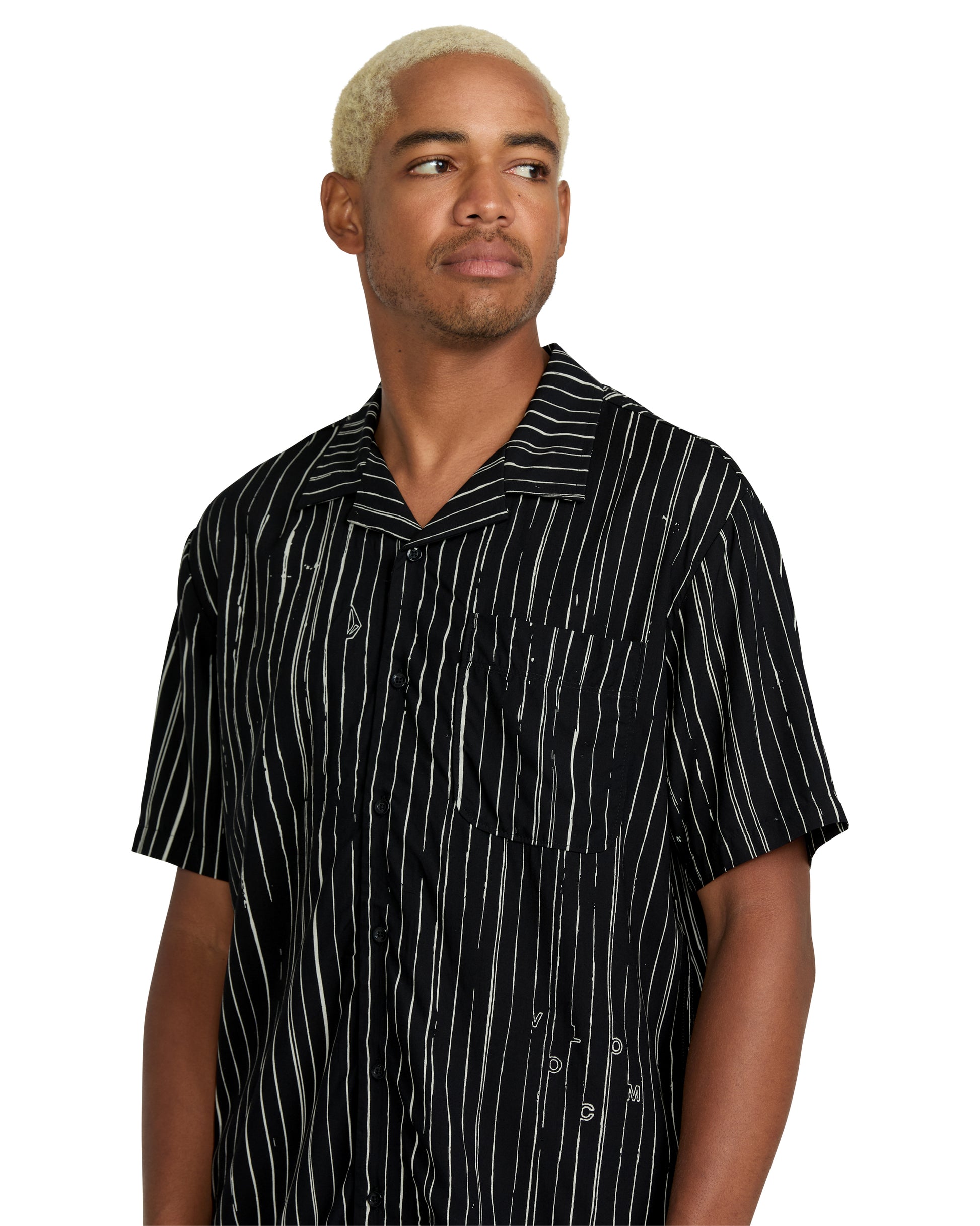 Black cotton shirt in a super relaxed fit. sketchy white pinstripe, casual as you like.